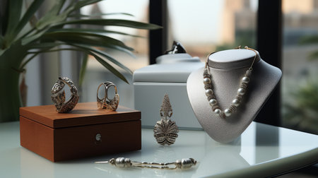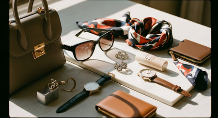 a tabletop setting with a mix of jewelry, handbags and shoes to create a dynamic look, created with generative ai