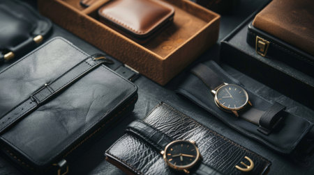 A display of luxury leather wallets and watches, showcasing elegant and sophisticated accessories with premium craftsmanship.
