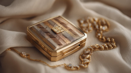 This stunning gold compact showcases an intricate design and sits elegantly next to a delicate chain on soft fabric, embodying luxury and sophistication.