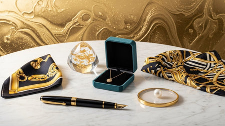 Pearl showing luxury still life with gold scarf, fountain pen, jewelry box with necklace, paperweight, and pearl....