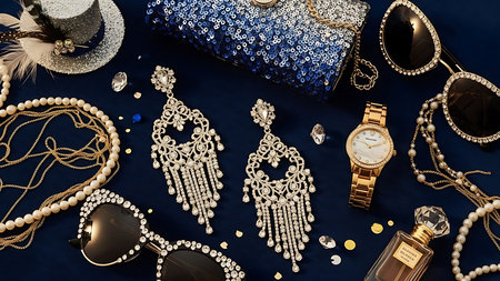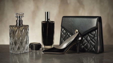 High-fashion essentials including clutch, heels, and perfume bottle arranged with soft lighting