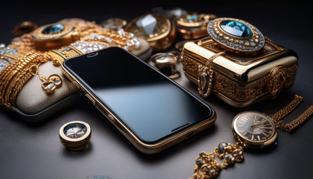 A stylish smartphone rests among shiny gold jewelry, sparkling gems, and ornate boxes, creating an elegant display of affect.
