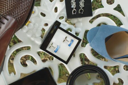 Wedding shoes, belts, watches and bouquet on a white surface. Accessories for the groom on the wedding day.