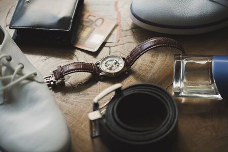 different accessories of a businessman for creating a style of a people lie on a wooden background