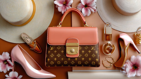 Stunning flat lay arrangement showcases a high-end handbag, elegant heels, and chic accessories surrounded by flowers, perfect for fashion and lifestyle inspiration.