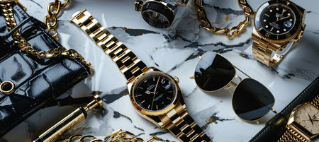 Discover a captivating flat lay of a stylish gold watch among luxurious black and gold accessories, showcasing elegance and sophistication in design and style.