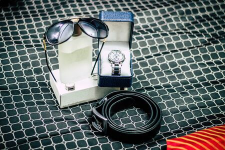 Mens accessories, leather belt, perfume, bow tie, grooms golden rings, watches and brides on a white table. Businessman clothing detail concept.