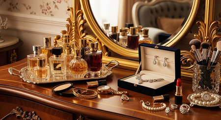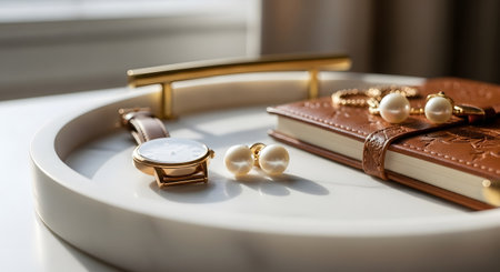 A luxurious arrangement featuring beauty products and exquisite jewelry on a marble surface, bathed in soft natural light, offering a serene and elegant atmosphere.