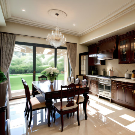 3d render of luxury kitchen and dining room in classic style. ia generated