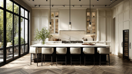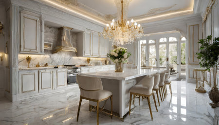 A beautifully designed modern classic white kitchen in a luxury apartment, showcasing a spacious marble-topped island as a dining table, sophisticated finishes, high-end appliances, and timeless