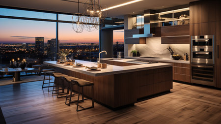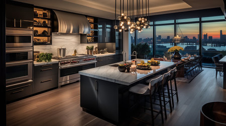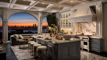 Luxurious Penthouse Kitchen: Opulence with Panoramic Skyline Views