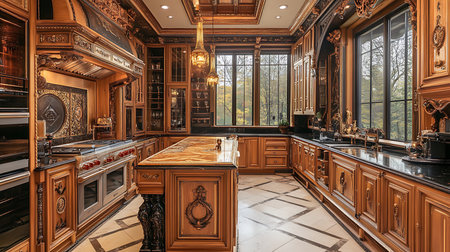 Explore a breathtaking luxurious kitchen design featuring intricate woodwork and elegant decor.