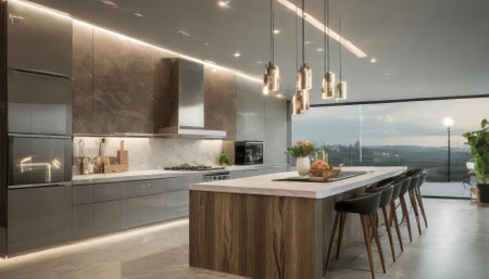 A contemporary kitchen interior with modern appliances, a large island, and a clean, minimalist aesthetic