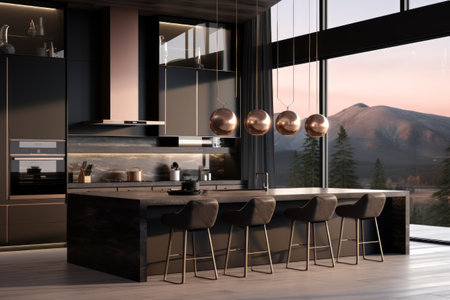 A contemporary kitchen featuring a stunning panoramic view of the mountains in the distance.