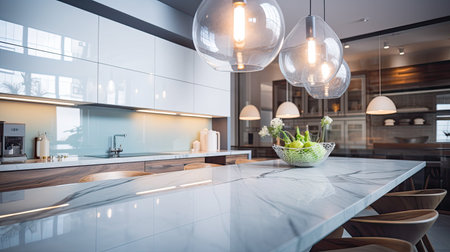 Interior of a modern kitchen with marble and white granite. Nobody inside