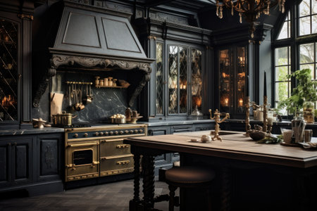 Interior design of Kitchen in Traditional style with Stove decorated with Wood, Stone, Glass, Metal, Ceramic material. Traditional architecture. Generative AI AIG24.