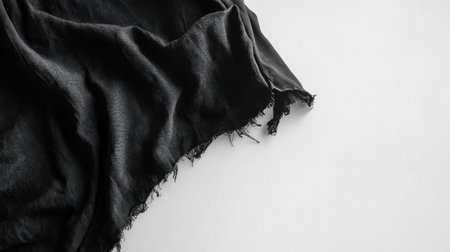 A beautifully draped piece of black fabric with frayed edges rests on a clean white surface, showcasing its soft texture and elegant aesthetic, perfect for creative projects.