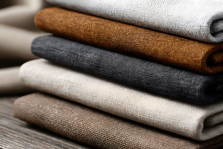 A collection of neatly folded linen fabrics in various colors rests on a wooden surface, illuminated by gentle light, showing the texture and richness of the materials.