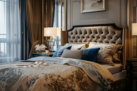 A luxury bedroom featuring a large, comfortable bed with an ornate headboard, golden accents, and soft lighting.