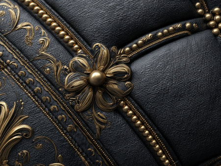 Exquisite gold floral ornamentation on richly textured dark leather, featuring intricate scrolls and raised beadwork, enhancing opulent design with luxurious details and elegance