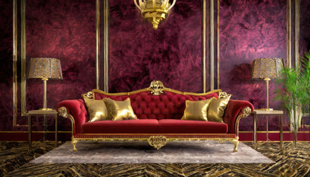 rich apartment interior with golden baroque decorations on the walls and luxury furniture. the room is flooded with the rays of the setting sun