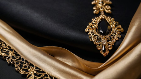 Luxurious Black and Gold Brocade Fabric Close-Up A detailed macro shot of intricate black and gold brocade fabric, with ornate