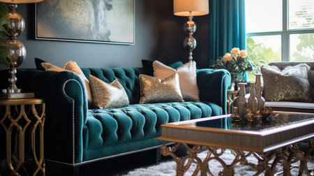 Living room decor, home interior design . Art Deco Contemporary style with Large Window decorated with Velvet and Marble material . Generative AI AIG26.