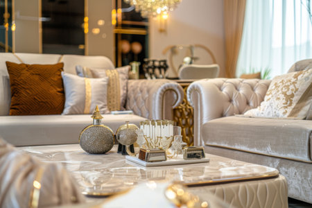 Luxury living room interior with sofa, table, mirror and gold decorations