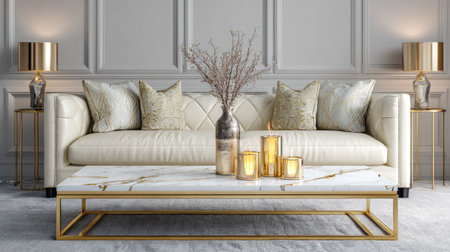 This sophisticated living room features a cream leather sofa adorned with stylish decorative pillows, a chic marble coffee table, and elegant lighting, creating a warm and inviting atmosphere.