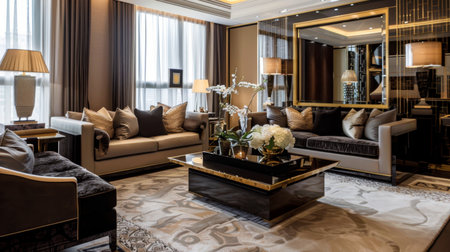 Luxurious modern living room with a sophisticated design. Dark wood furniture, rich textiles, and gold accents. Large mirrors, elegant lighting, and plush seating.