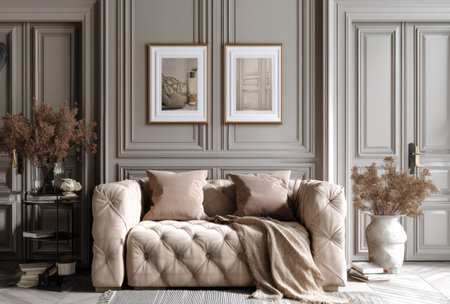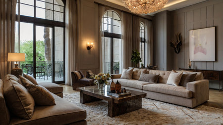 Luxury living room interior design with beige sofa and coffee table