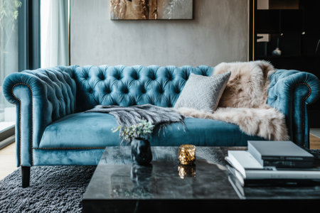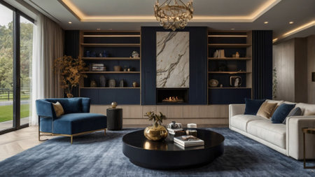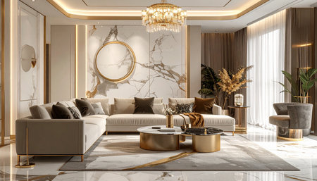 Luxury living room interior design with sofa and coffee table.