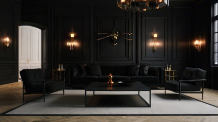 A luxurious dark living room with black furniture, gold accents, and elegant lighting fixtures creates a sophisticated atmosphere.