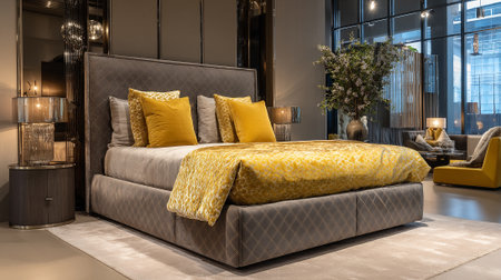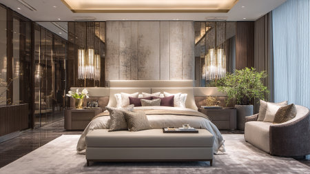 Luxurious Bedroom Interior Featuring Elegant Bedding and Stylish Furnishings with Refined Ambiance