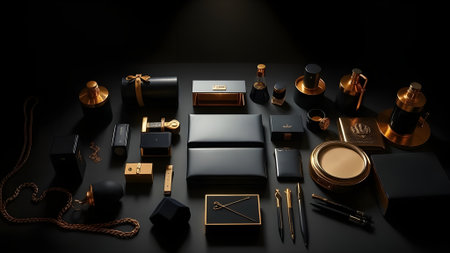 Luxury black cosmetics set on black background. 3D rendering