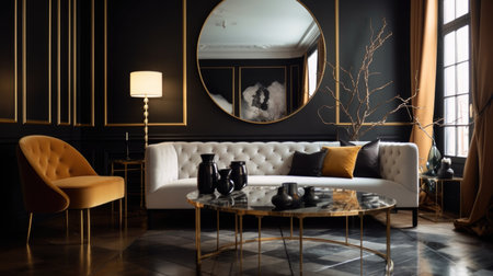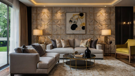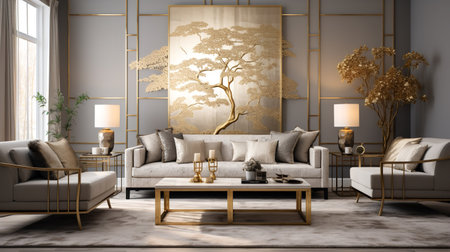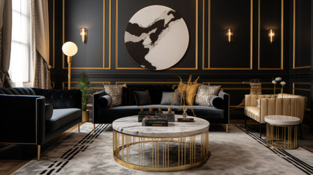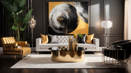 Living room decor, home interior design . Modern Art Deco style with Large Artwork decorated with Metal and Glass material . Generative AI AIG26.