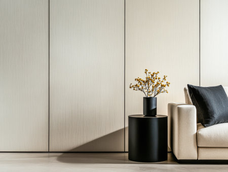 A cozy living area showcases a sleek cream sofa beside a minimalist black side stable, adorned with a modest vase of flowers. Natural light highlights the space elegant design.
