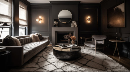 Interior design of Living Room in Modern style with Fireplace decorated with Plush Rug, Velvet Sofa material. Contemporary architecture. Generative AI AIG24.