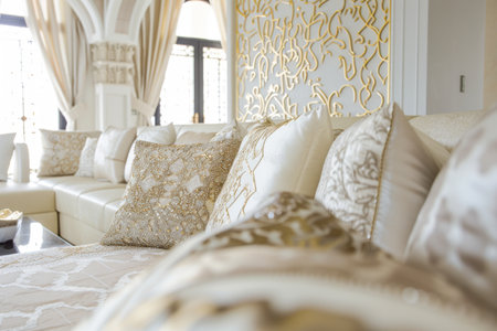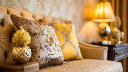 A beautifully arranged living room showcasing elegant cushions and sophisticated decor. Warm lighting enhances the inviting atmosphere, perfect for home styling.