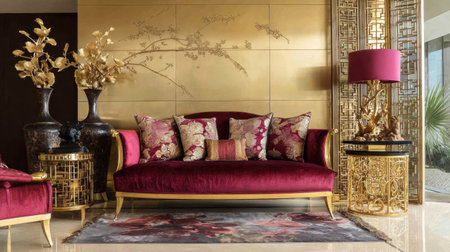 Luxurious room with velvet furnishings, gold accents, and abstract decorative sculptures arranged tastefully