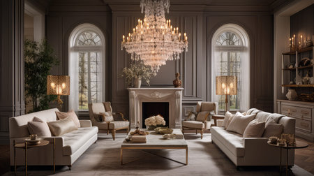 Luxurious living room with elegant chandelier and cozy fireplace in classic interior design. That the image is generated using AI.