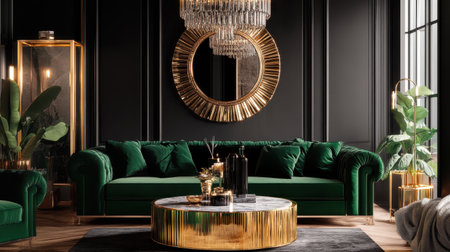 Interior Luxurious Living Room with Emerald Velvet Sofa, Black Accent Wall, and Crystal Chandelier