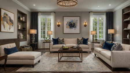 Experience the charm of this elegant living room featuring modern furniture and stylish decor. The warm colors and chic accessories create a cozy atmosphere.