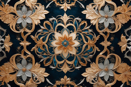 Seamless gold floral damask pattern repeating on a dark background, creating an elegant and luxurious design. Ai generated image