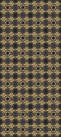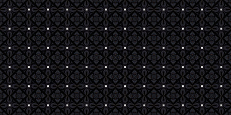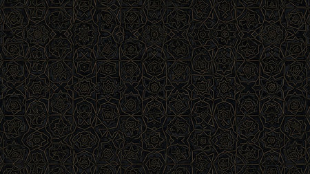 An intricate dark background a repeating geometric pattern of interlocking stars and floral motifs in subtle gold and black tones.