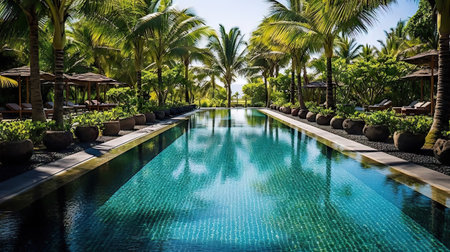 Experience the serene atmosphere of a stunning tropical resort pool surrounded by lush palm trees. Enjoy the tranquil setting and relaxation.