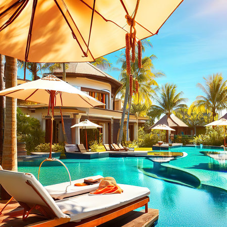 Idyllic luxury resort offers tranquil poolside relaxation in tropical paradise generated by artificial intelligence