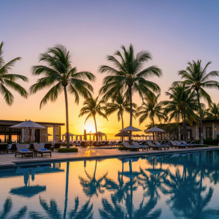 A serene tropical resort pool reflects the vibrant hues of a setting sun. Tall palm trees sway gently in the breeze, casting long shadows on the deck. Loungers and umbrellas are arranged around the pool, inviting relaxation. The warm, golden light creates a tranquil atmosphere.