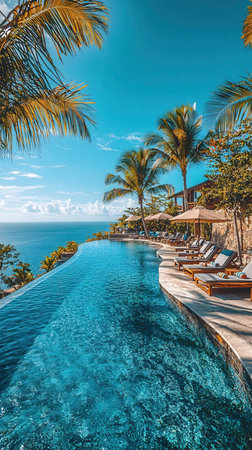 A serene tropical resort featuring palm trees, lounge chairs, umbrellas, and a stunning ocean view by the swimming pool. Perfect for relaxation and soaking up the sun.