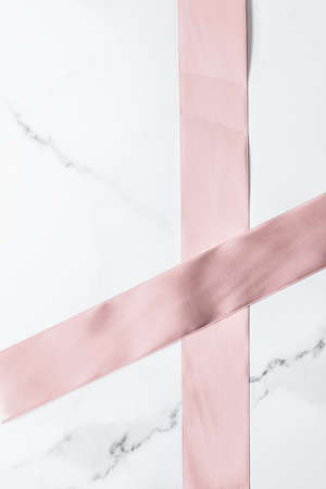 Birthday, wedding and girly branding concept - Beige silk ribbon and bow on marble background, glamour present mockup and fashion gift decoration for luxury beauty brand holiday flatlay design